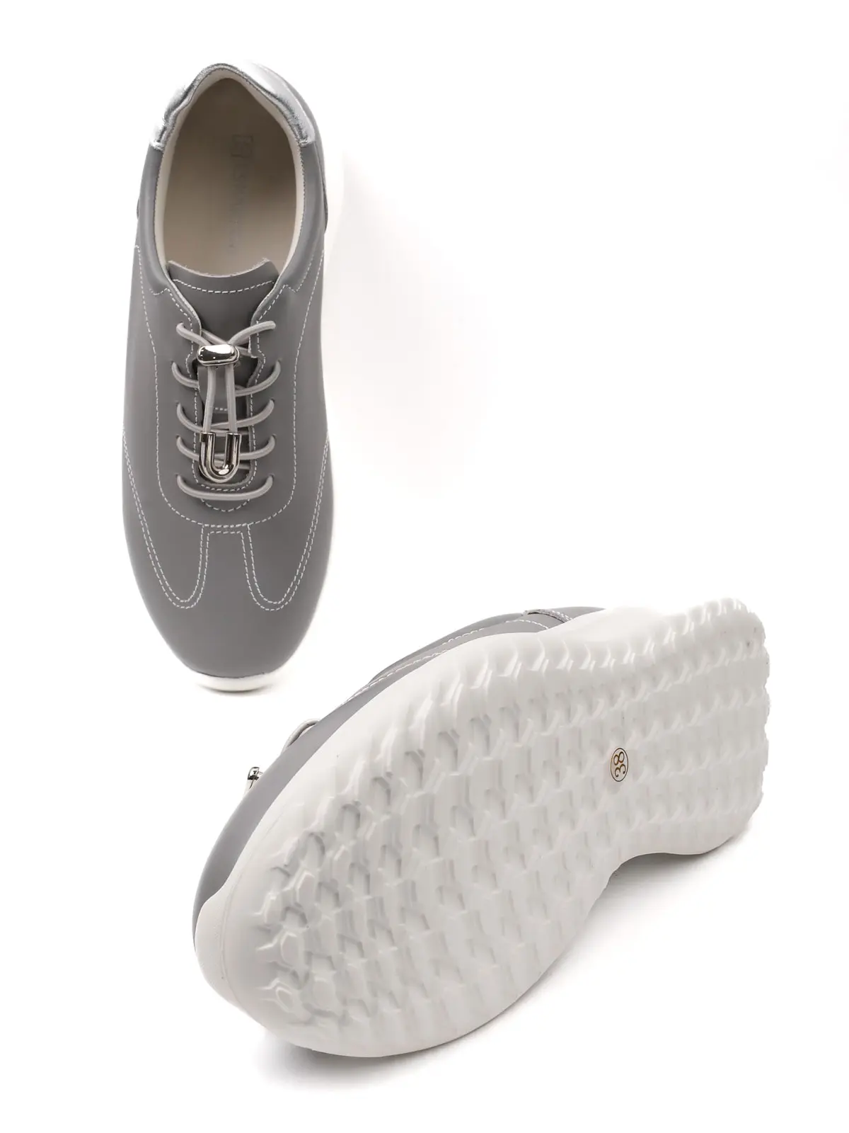 - Style and Design: The easy-to-combine grey color creates a unique look, complemented by white decorative stitching and a shiny silver (metallic) detail on the heel.