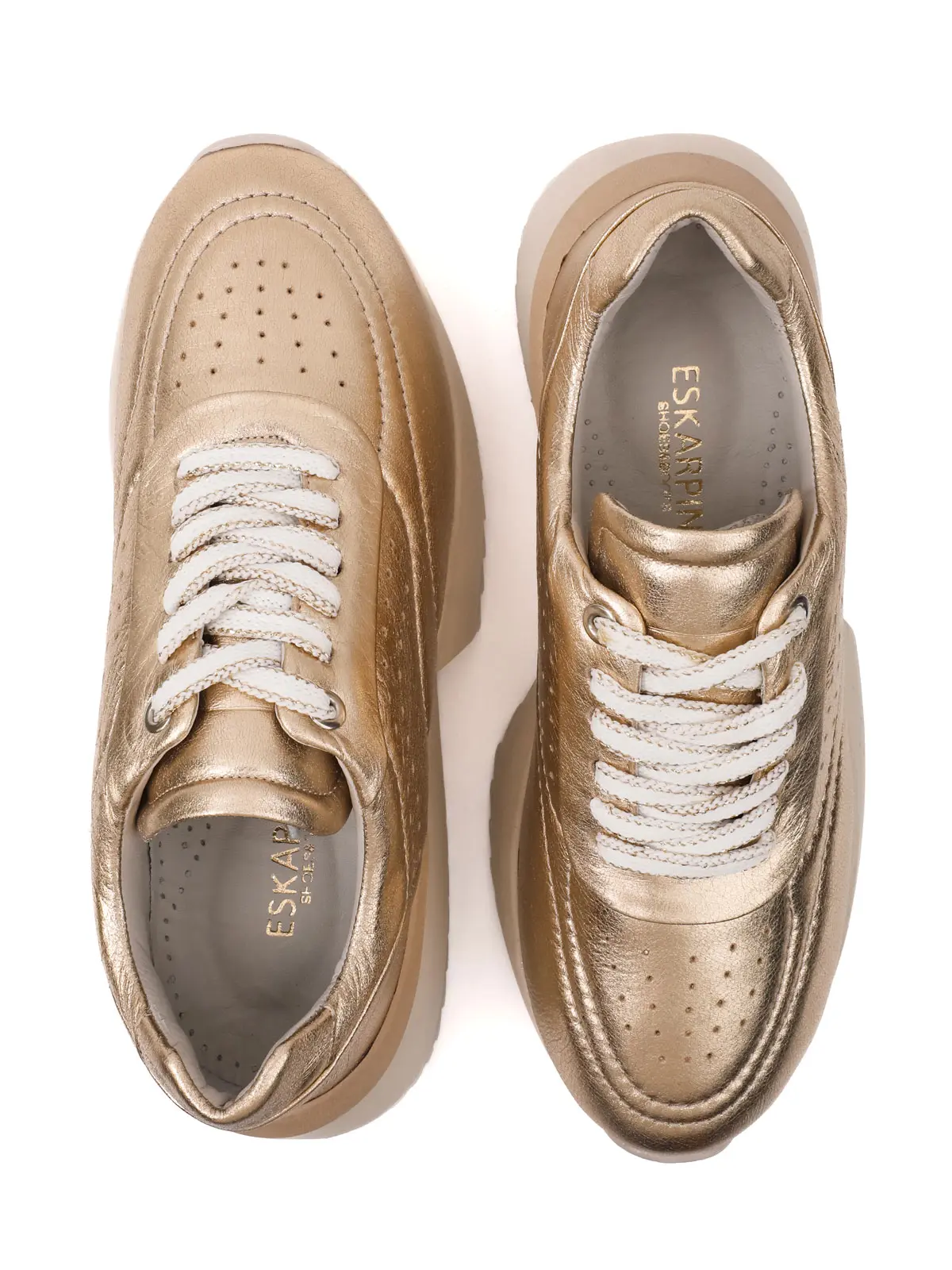 Golden Sparkle in Your Steps! These magnificent Gold Platform Sneakers from Eskarpini's new collection are specially designed for women who want to add shine to their style. Combining both sporty and classic details, this model will ensure your comfort all day long with its high-quality genuine leather and comfortable platform sole.