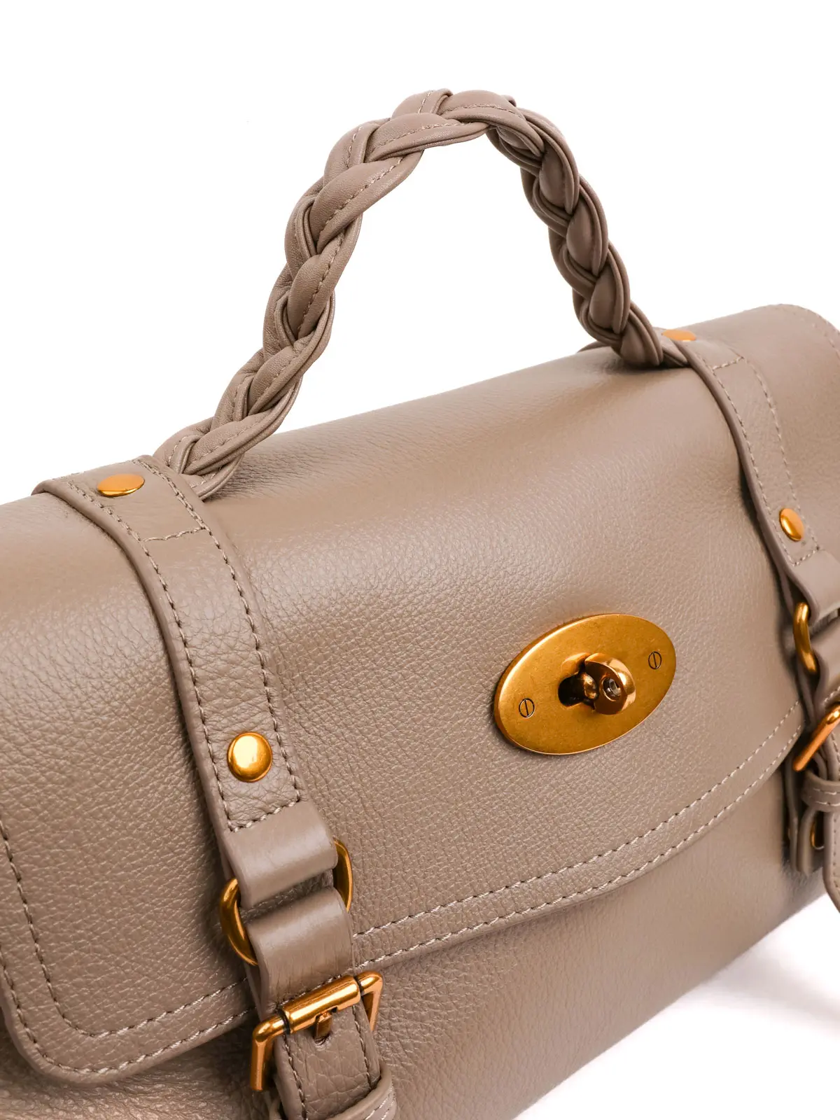 Details: Gold metal accessories, braided handle, front locking flap, zippered inner pocket.