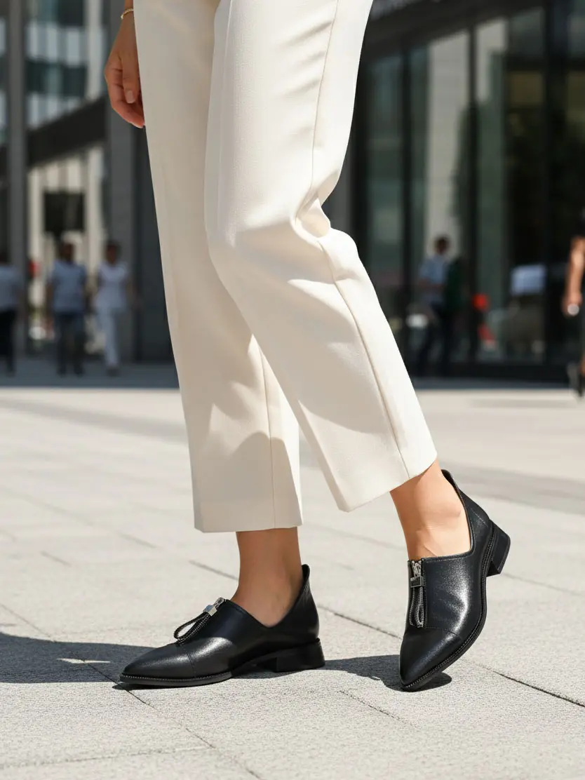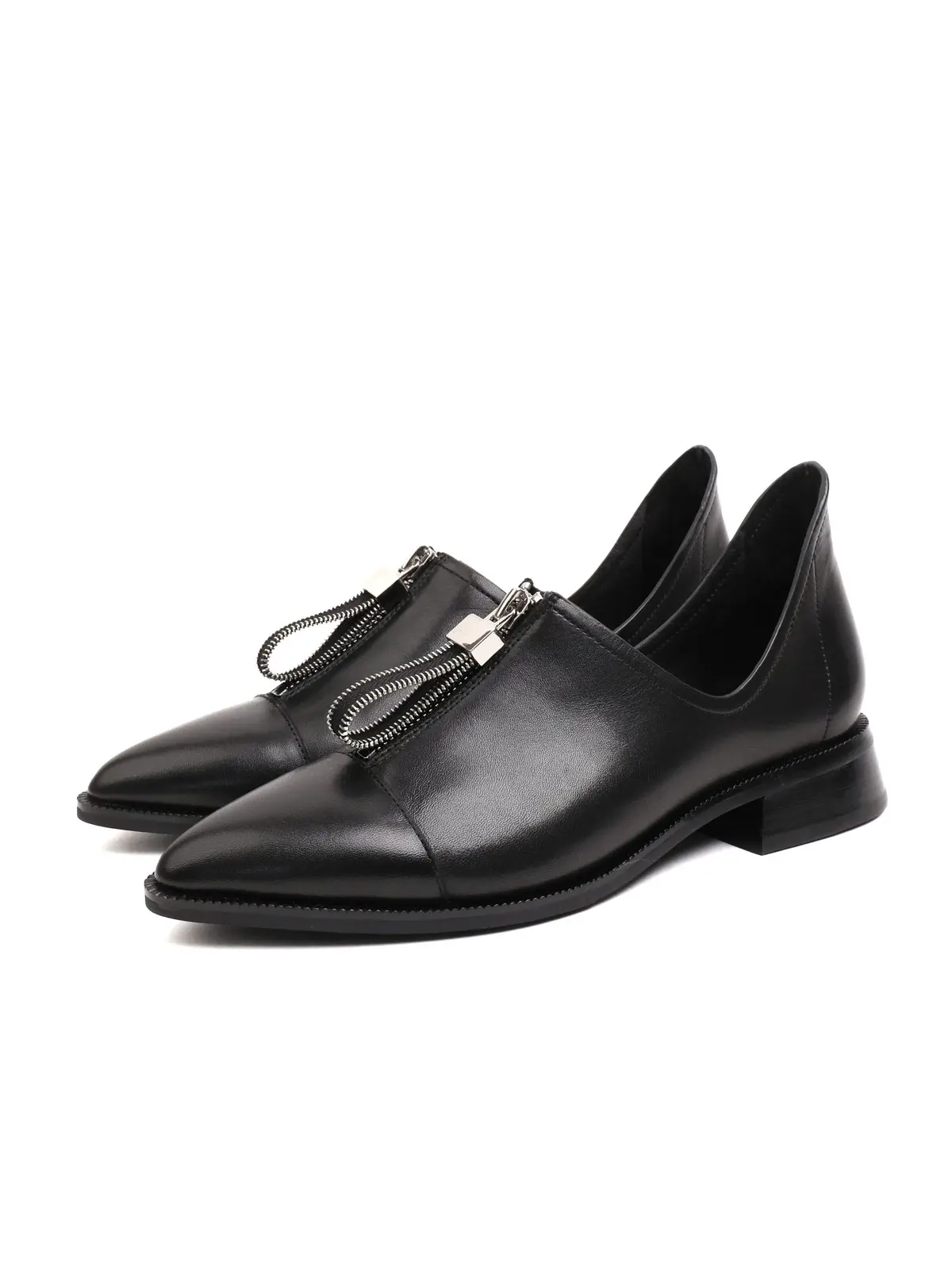 Details That Make a Difference The pointed-toe design creates a more elegant and slender look on the foot. The silver-colored, chunky zipper accessory on the front adds a contemporary and charismatic vibe to the shoe. The cut-out sides not only make them easy to put on and take off but also make them an ideal choice for the spring and autumn seasons.