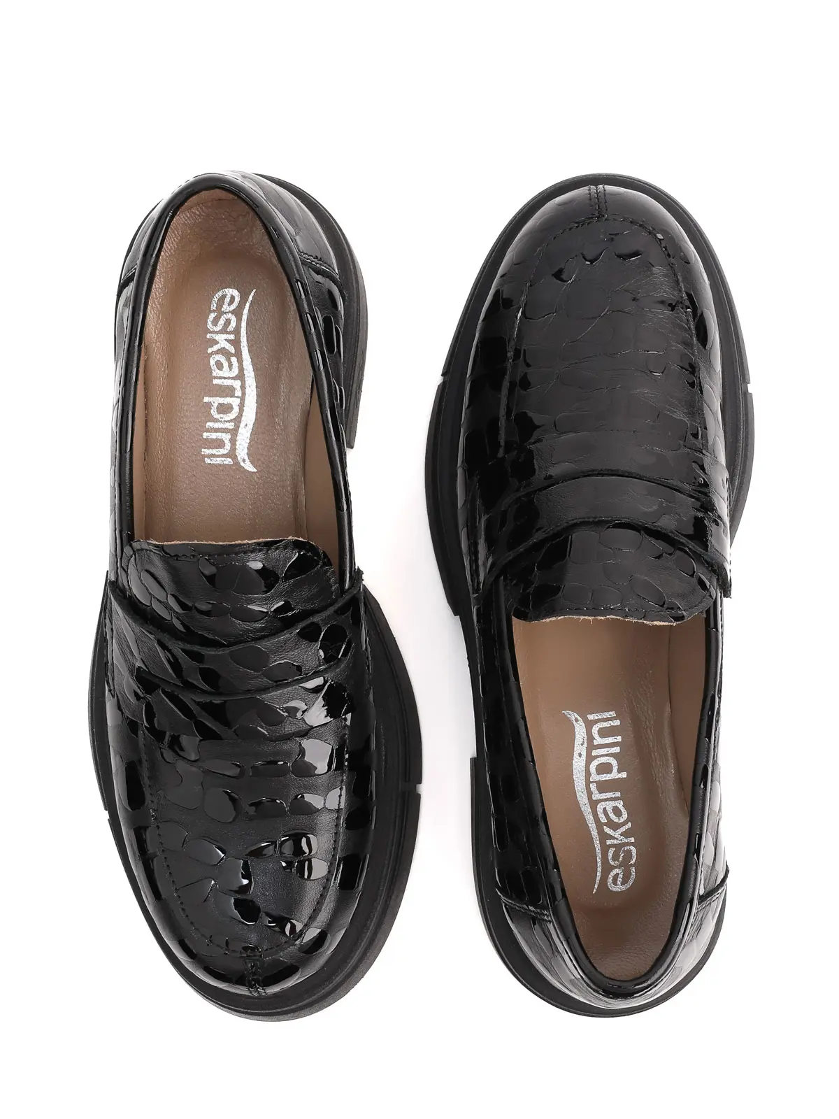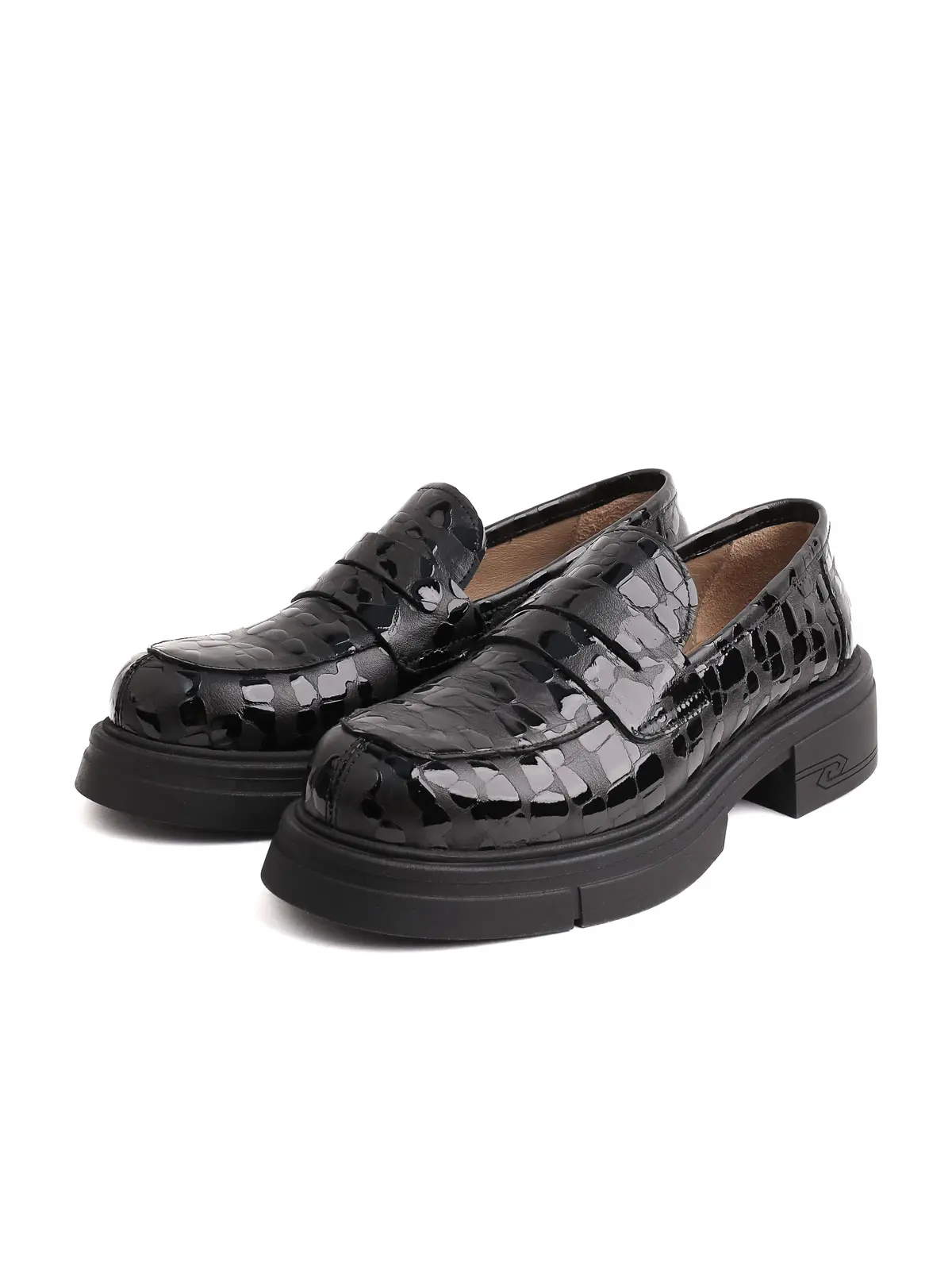 Women's Genuine Leather Loafers – Glossy Crocodile Pattern with Chunky Sole