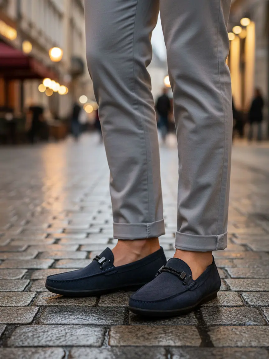 Natural Suede Dark Blue Men's Moccasin with Metal Accessory