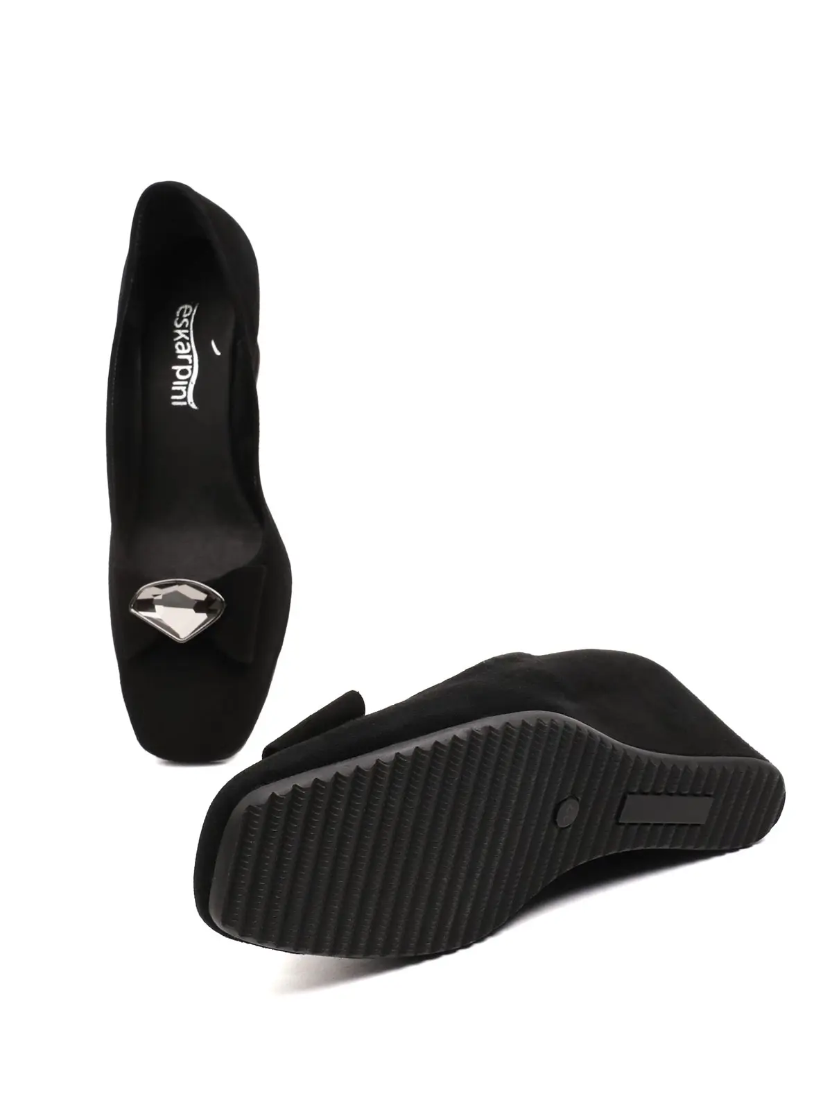 Eskarpini Women's Black Genuine Suede Wedge Daily Shoes with Rhinestones