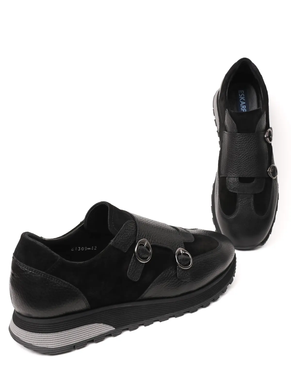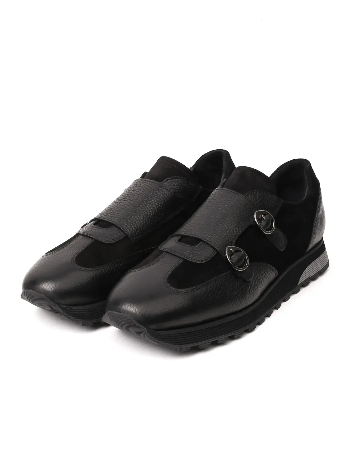 The upper surface of the product displays a masterful combination of two different leather textures. On the side panels, special textured (embossed) leather is used, giving the shoe a rich depth and a modern feel. This texture is accompanied by smooth, first-class plain leather used on the straps, toe, and heel. This textural contrast, despite the shoe's completely black (monochrome) design, presents an eye-catching and layered look.