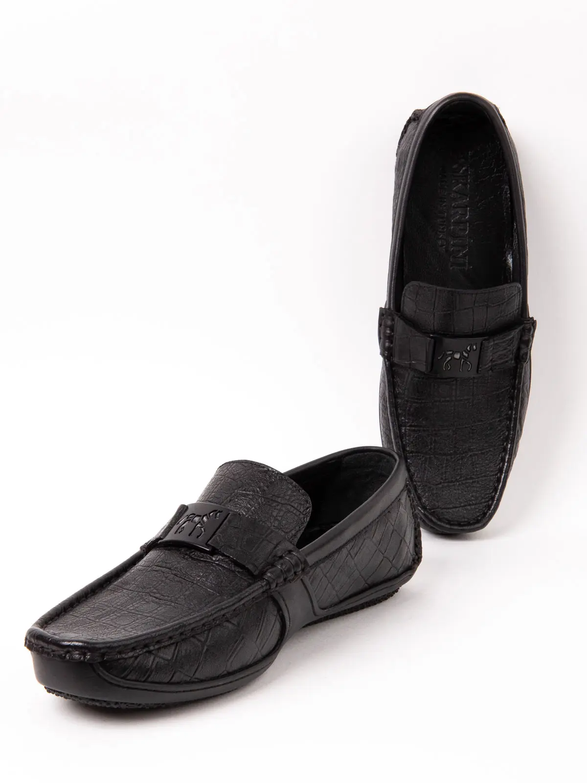 Elevate your style to the next level with the Eskarpini 1178-727-4 model, which blends elegance with bold design. Crafted from high-quality leather, these loafers capture attention with their striking crocodile-embossed pattern. The nobility of the black color ensures a perfect match with any outfit. The model's most eye-catching detail is the special metal Eskarpini logo, featuring a horse figure, on the vamp. This accessory adds a luxurious and unique character to the shoe. Ideal for both daily wear and semi-formal events, this moccasin-cut loafer promises all-day comfort thanks to its comfortable inner structure. It is poised to become a classic yet assertive piece in your wardrobe.