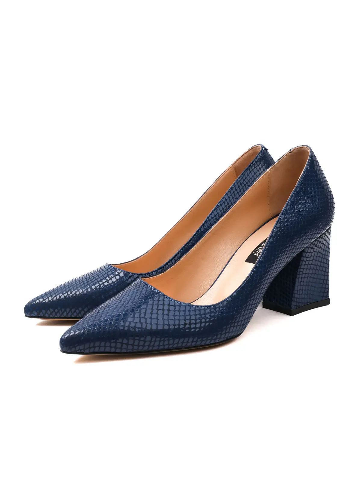 Natural Leather Dark Blue Snake Pattern Block Heel Women's Shoes (7 cm)
