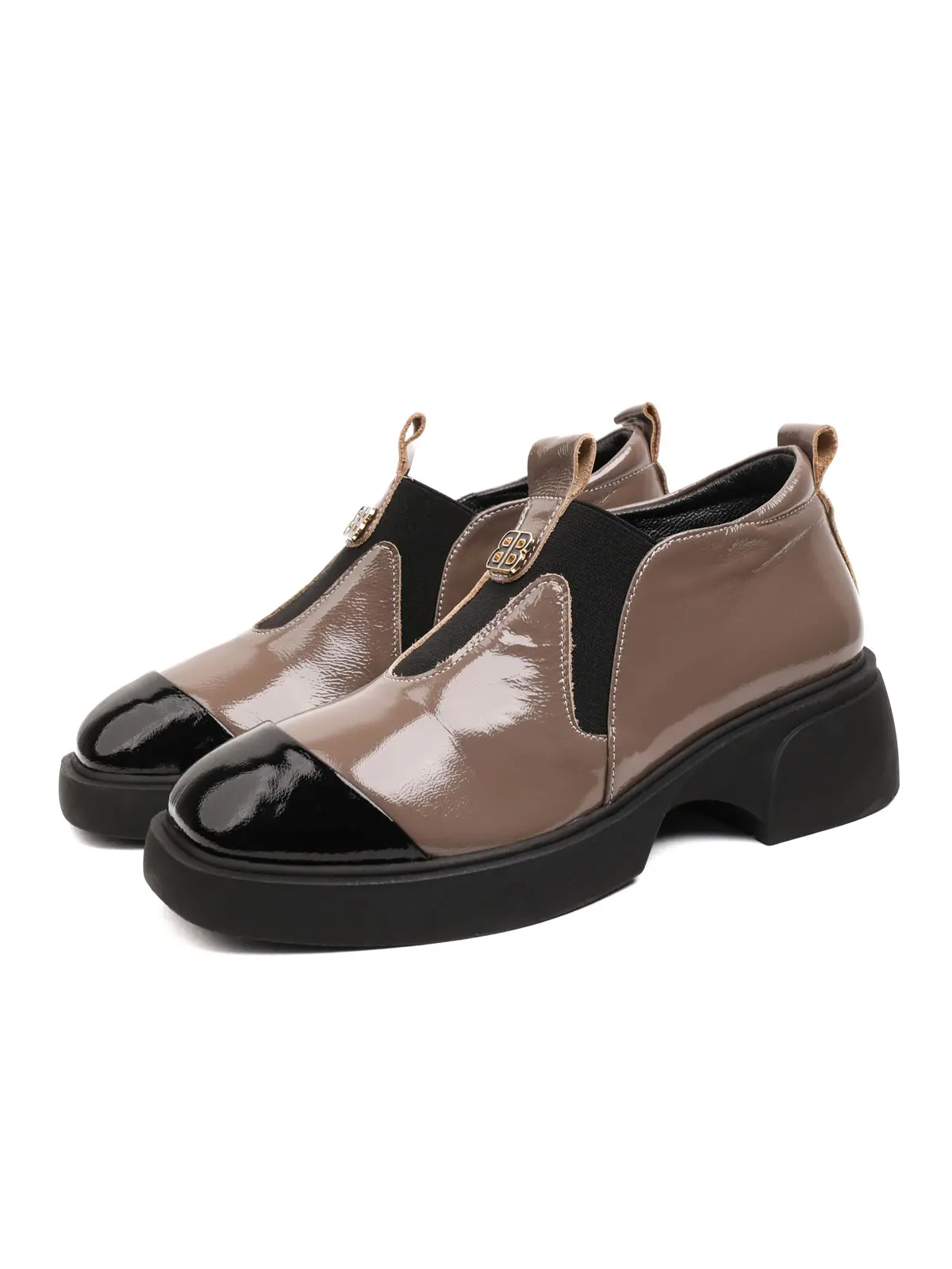 Eskarpini Women's Genuine Patent Leather Platform Loafers - Taupe/Black Combo