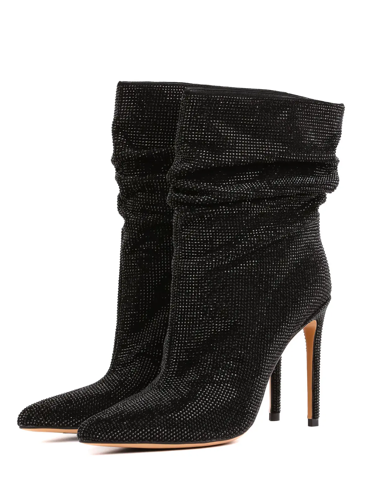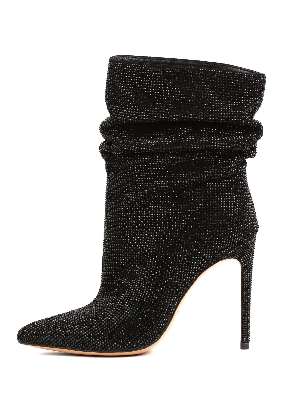 Kristal Taşlı ve Büzgülü Tasarım Siyah Nubuk Yarım Çizme (10 cm)
