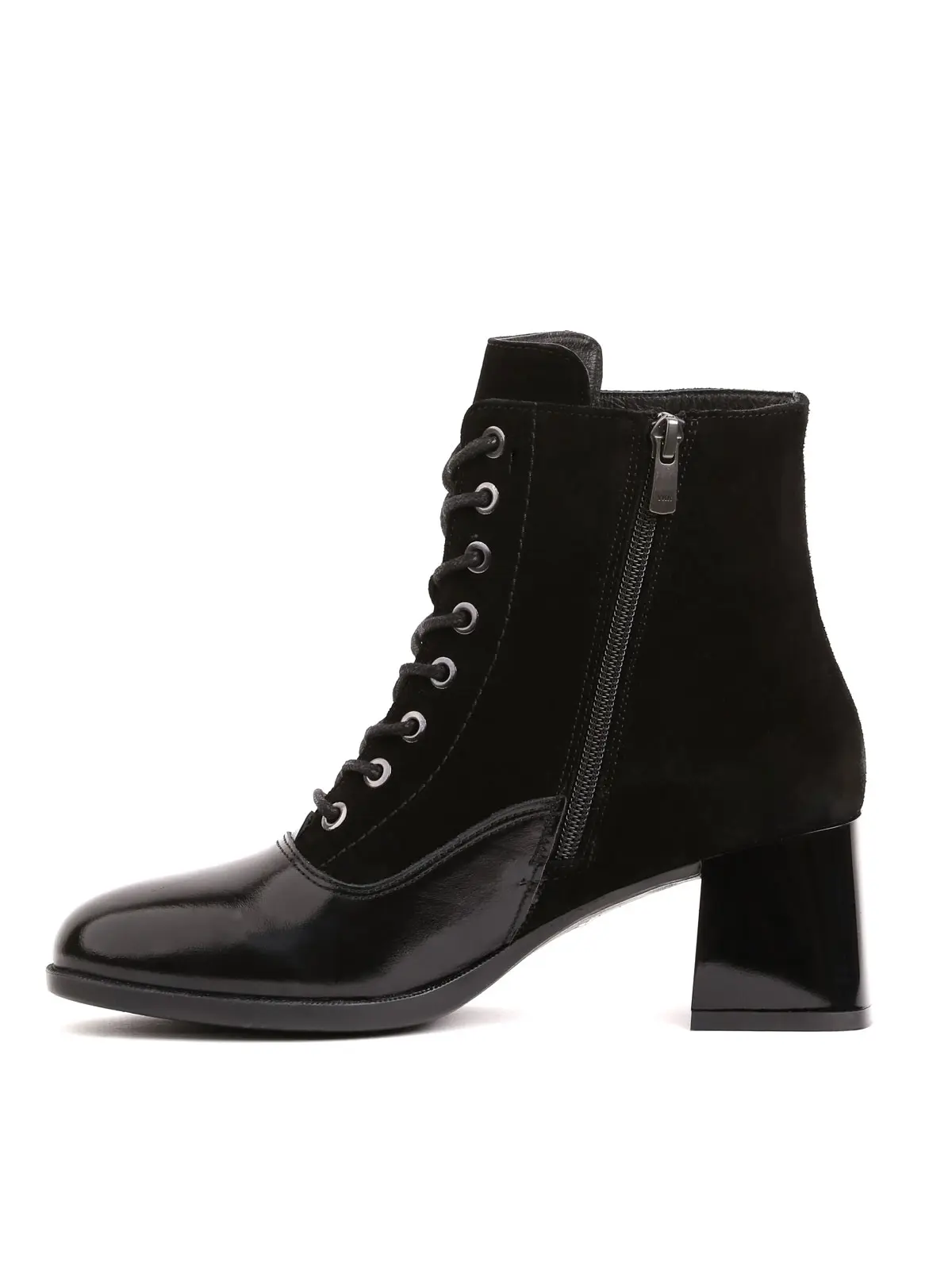 Siyah Hakiki Deri ve Süet Kombinasyonlu, Rugan Burun Detaylı Bağcıklı Kadın Botu