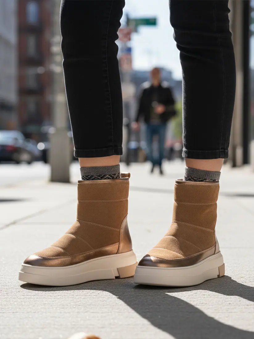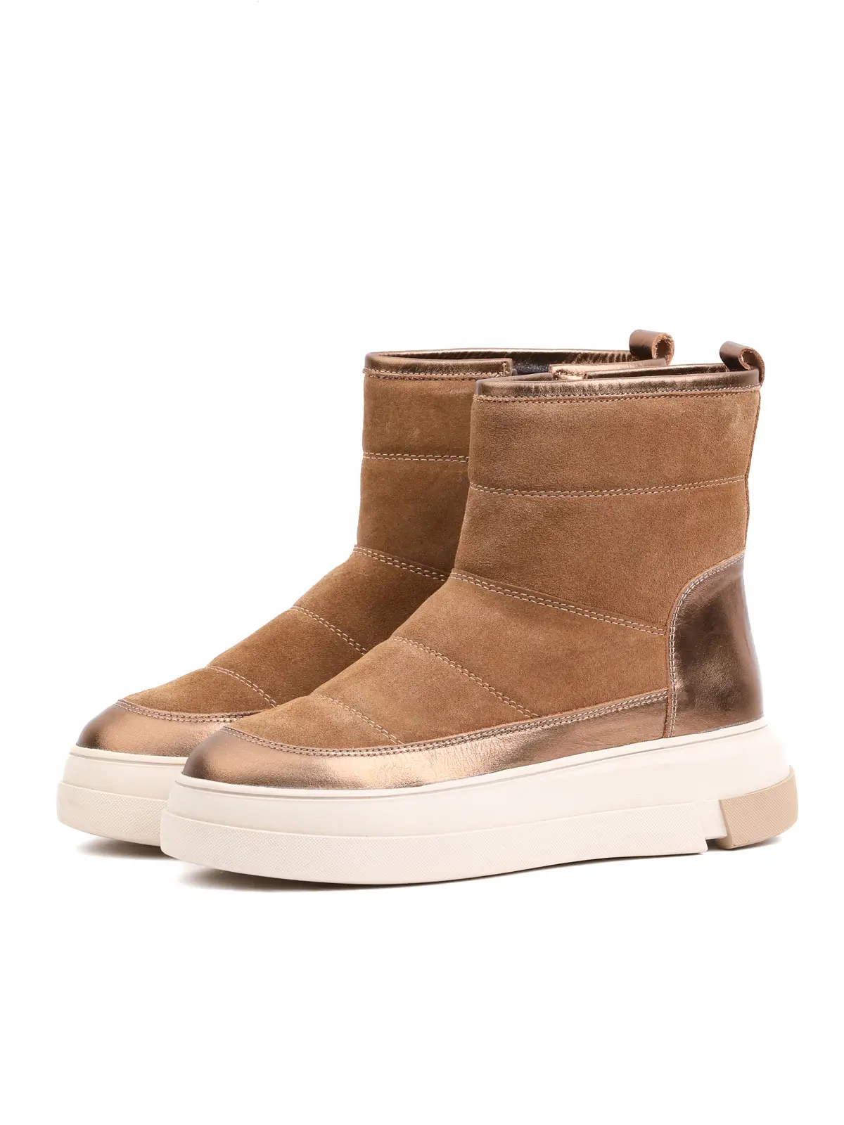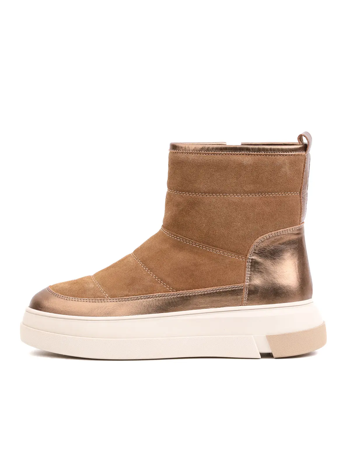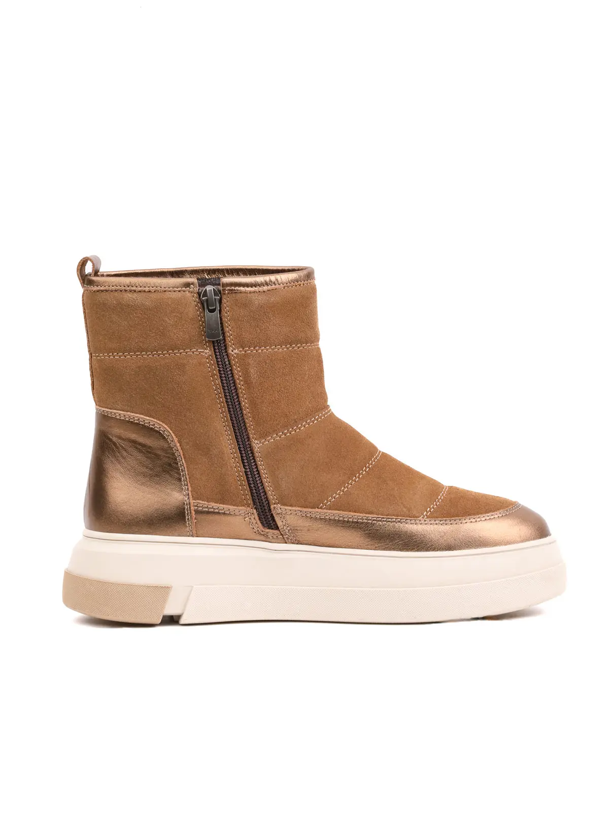 Ürünün ön ve bilek kısmındaki yatay dikişler modern bir "puffer" görünümü yaratırken, burun ve topuk kısmındaki bronz renkli metalik deri detayları ayakkabıya özel bir zarafet katıyor.