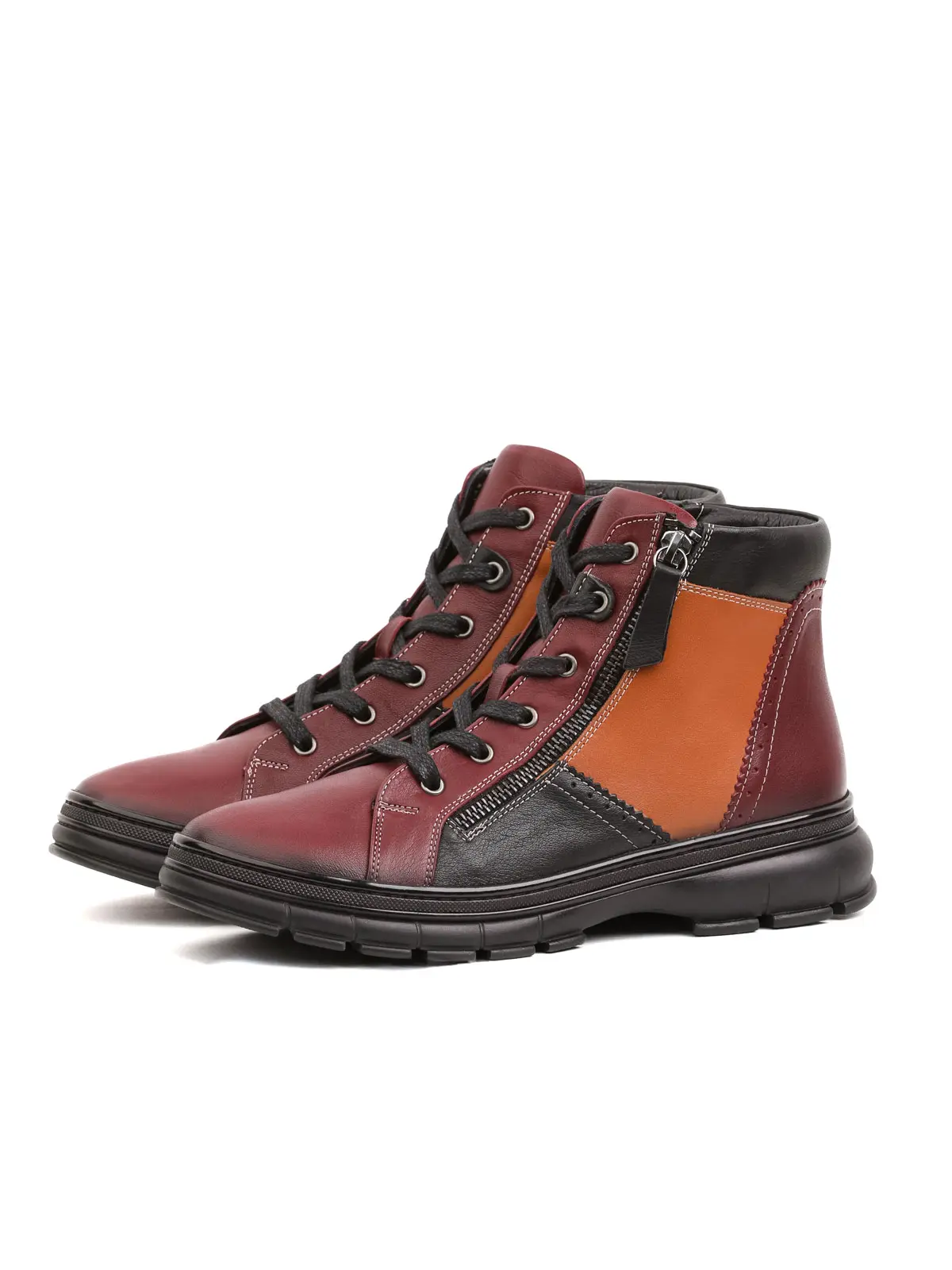 Trio Style Hakiki Deri Kadın Botu – Bordo, Siyah ve Turuncu Kombinasyonlu