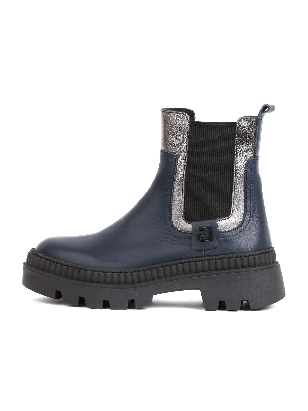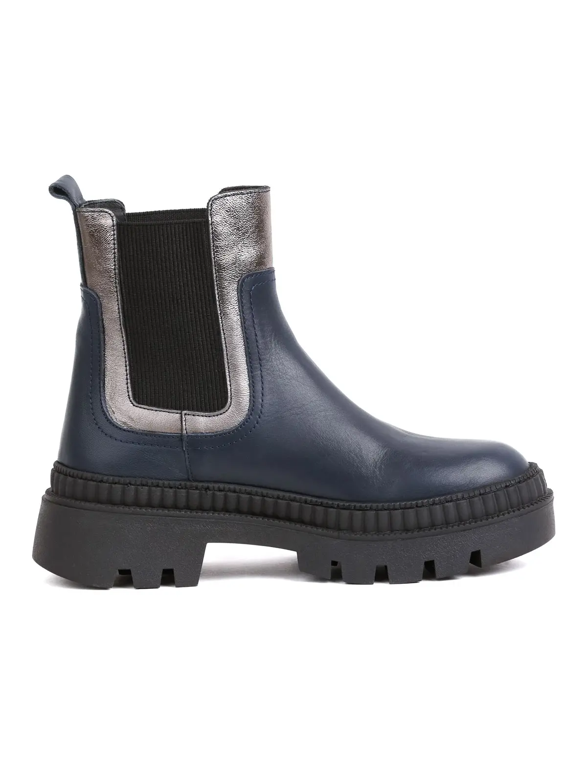 Tünd mavi rəngin zadəganlığı, boğaz hissəsindəki gümüşü (metallik) dəri detalları ilə birləşərək ayaqqabıya modern və gözoxşayan bir hava qatır. Klassik "Chelsea" bot tərzindən ilhamlanaraq dizayn edilən bu model, yan tərəflərindəki elastik rezinlər sayəsində ayağa asanlıqla geyinilib çıxarıla bilir.