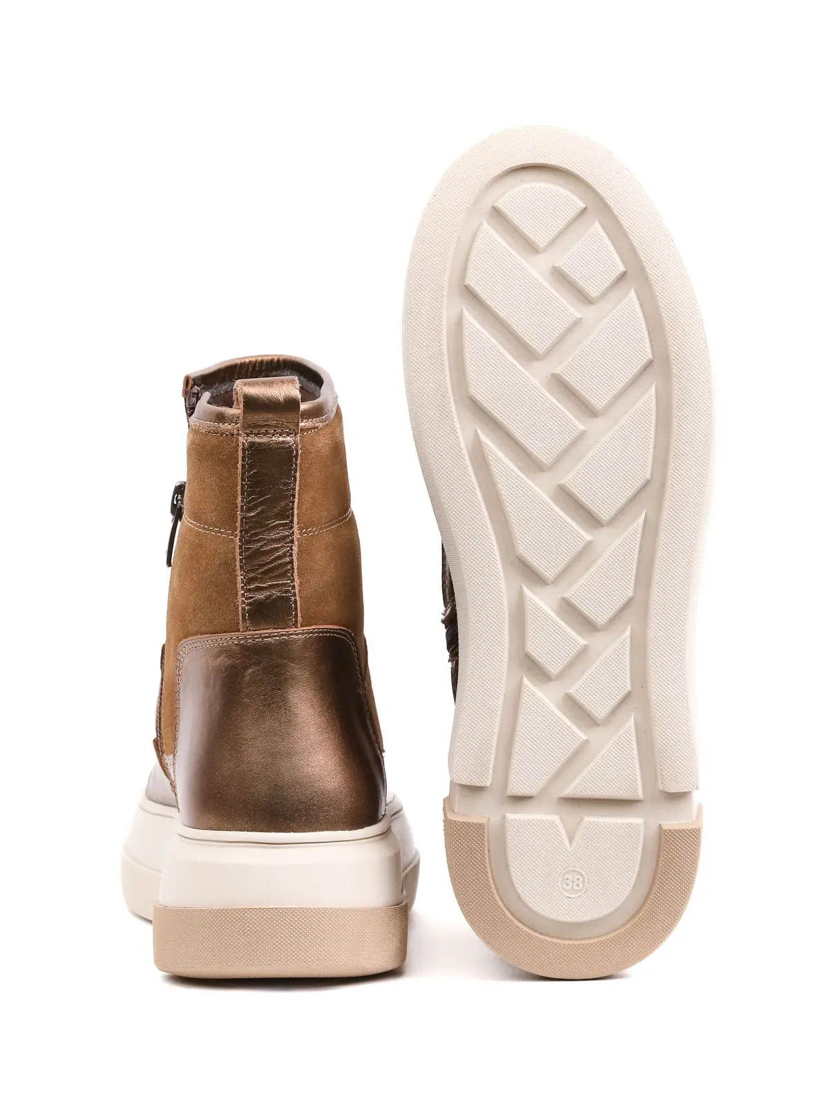 Məhsulun ön və boğaz hissəsindəki horizontal tikişlər müasir bir "puffer" görünüşü yaradırken, burun və daban hissəsindəki bürünc rəngli metalik dəri detalları ayaqqabıya xüsusi bir zəriflik qatır.
