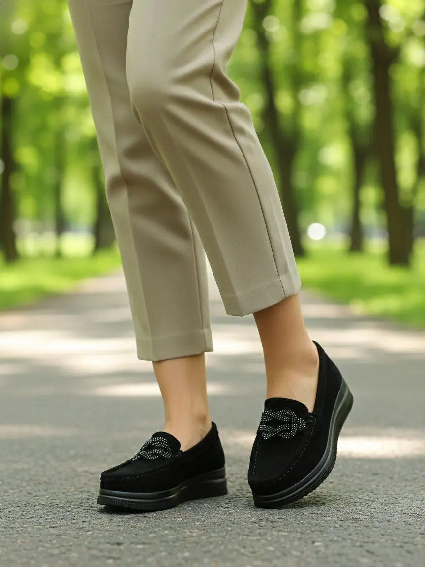 Eskarpini-nin xüsusi dizaynı olan bu qara platforma ayaqqabı, həm gündəlik həyatınızda, həm də ofis şıqlığınızda sizə yoldaşlıq etmək üçün hazırlanıb. Təbii zamşa dərinin yumşaq toxunuşu və ön hissəsindəki parıltılı daşlı düyün detalı ilə bu model, sadə kombinlərinizə belə zəngin bir görünüş qatacaq.