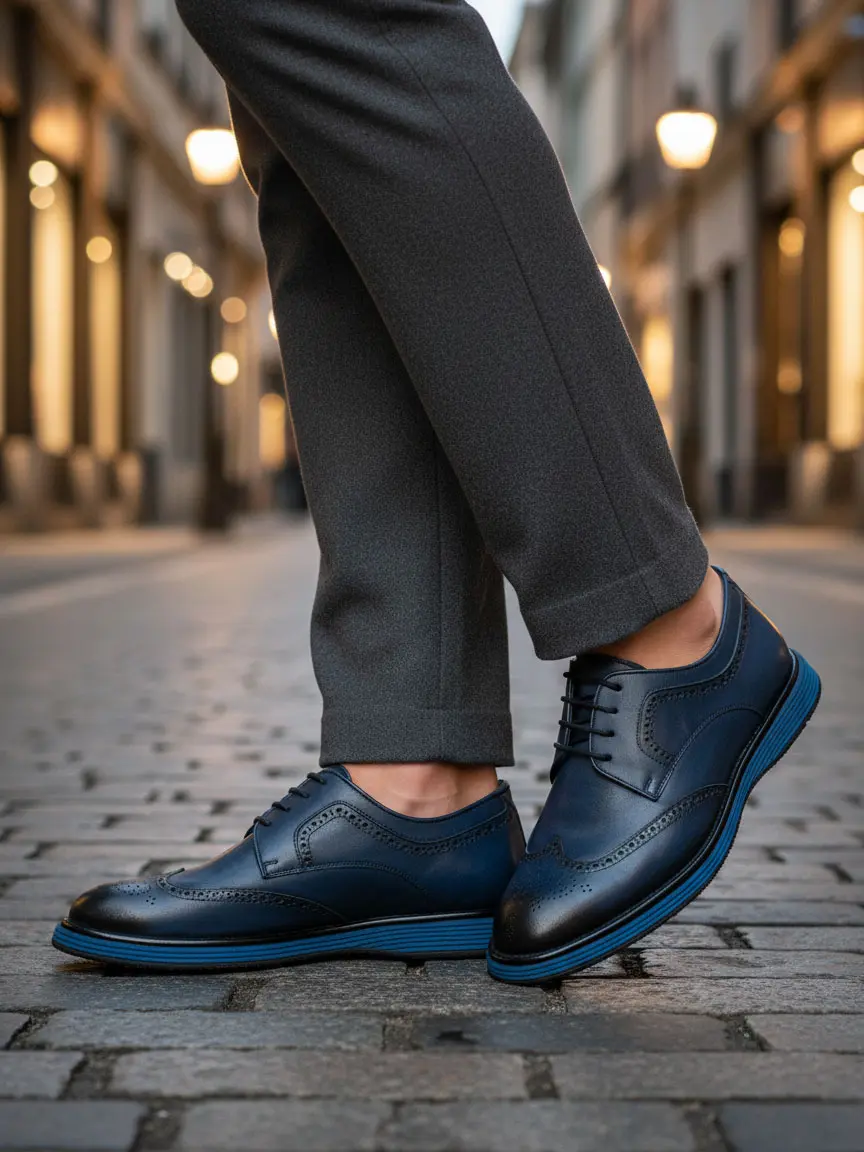 Tünd Mavi Dəri Klassik Kişi Ayaqqabısı - Kontrast Mavi Dabanlı