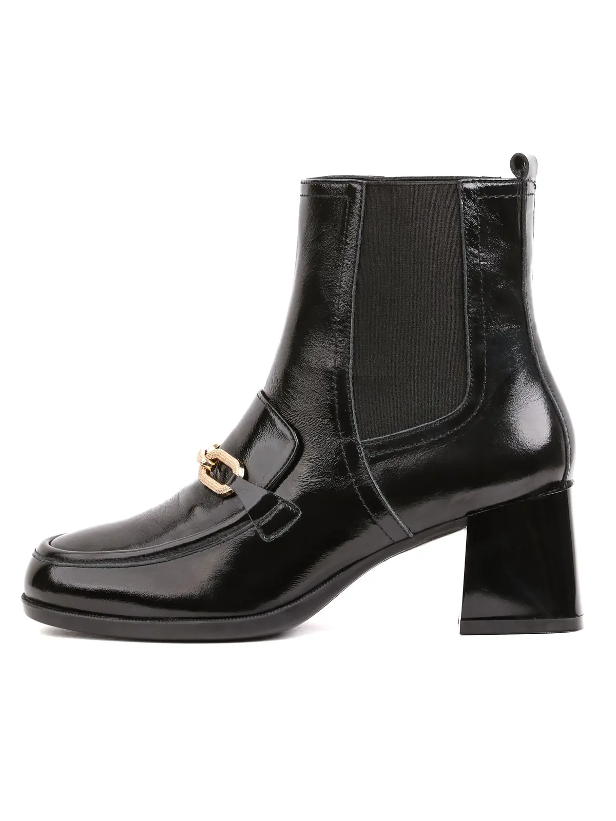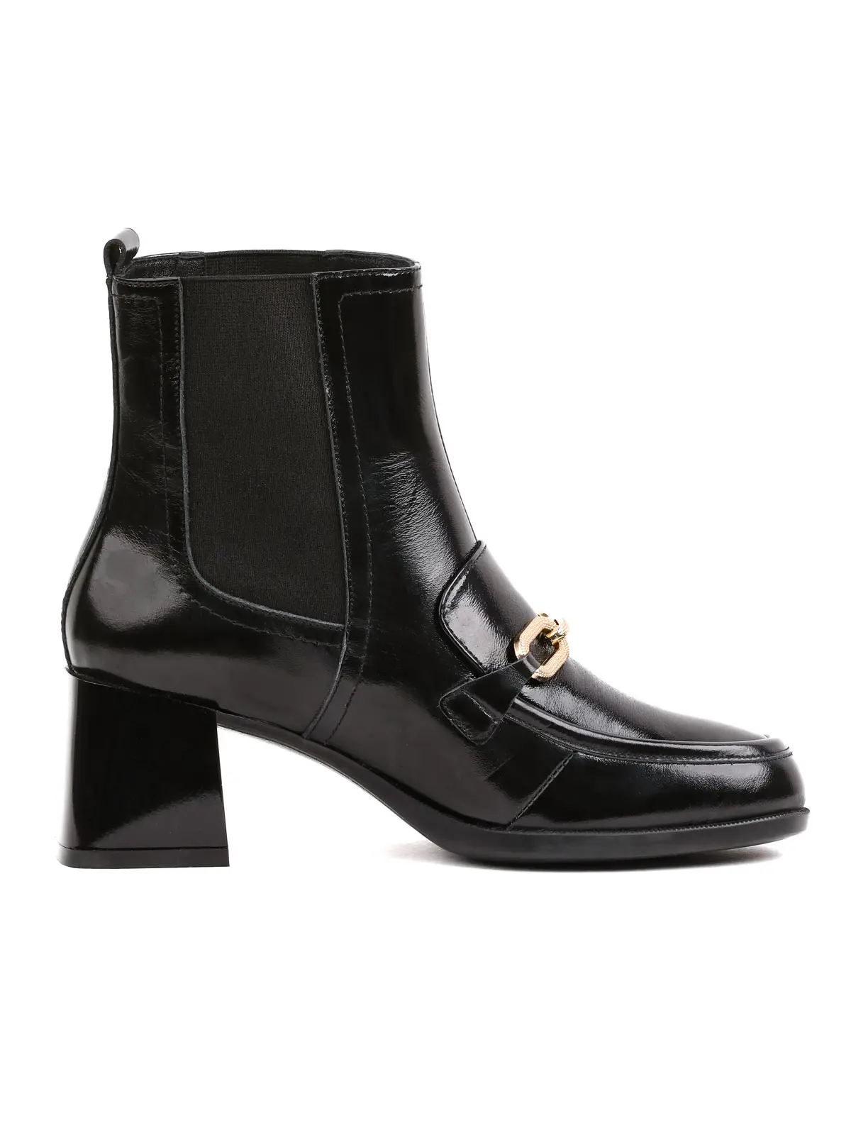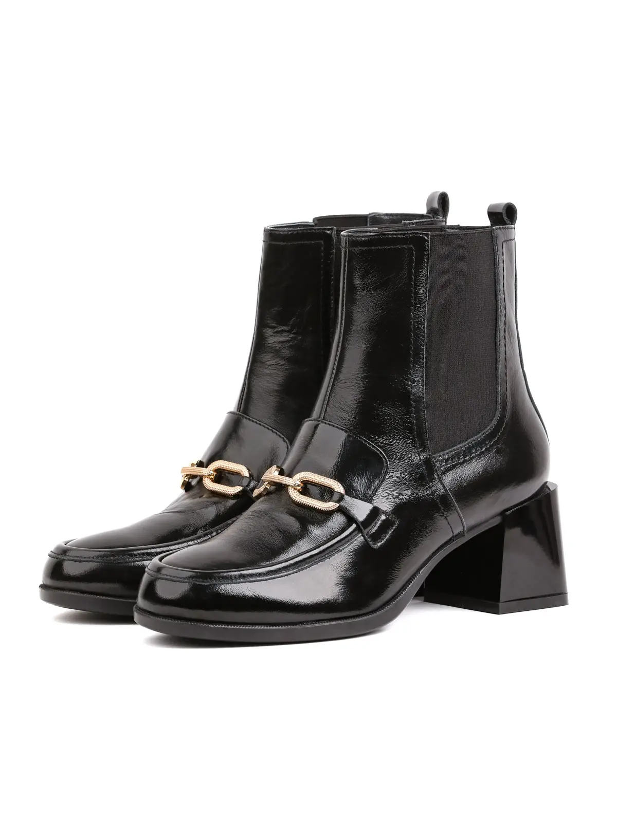 Parlak (rugan görünümlü) deri duruşu ile her adımda dikkatleri üzerine çeken bu botlar, ön kısmındaki altın zincir detayı ile lüks bir hava yaratıyor. Yan taraflarındaki elastik kısımlar (Chelsea tarzı) sayesinde ayakkabıyı giyip çıkarmak oldukça kolaydır. Orta yükseklikteki blok topuk tasarımı ise gün boyu yorulmadan, hem ofiste hem de günlük hayatta rahatlıkla kullanmanıza olanak tanır.