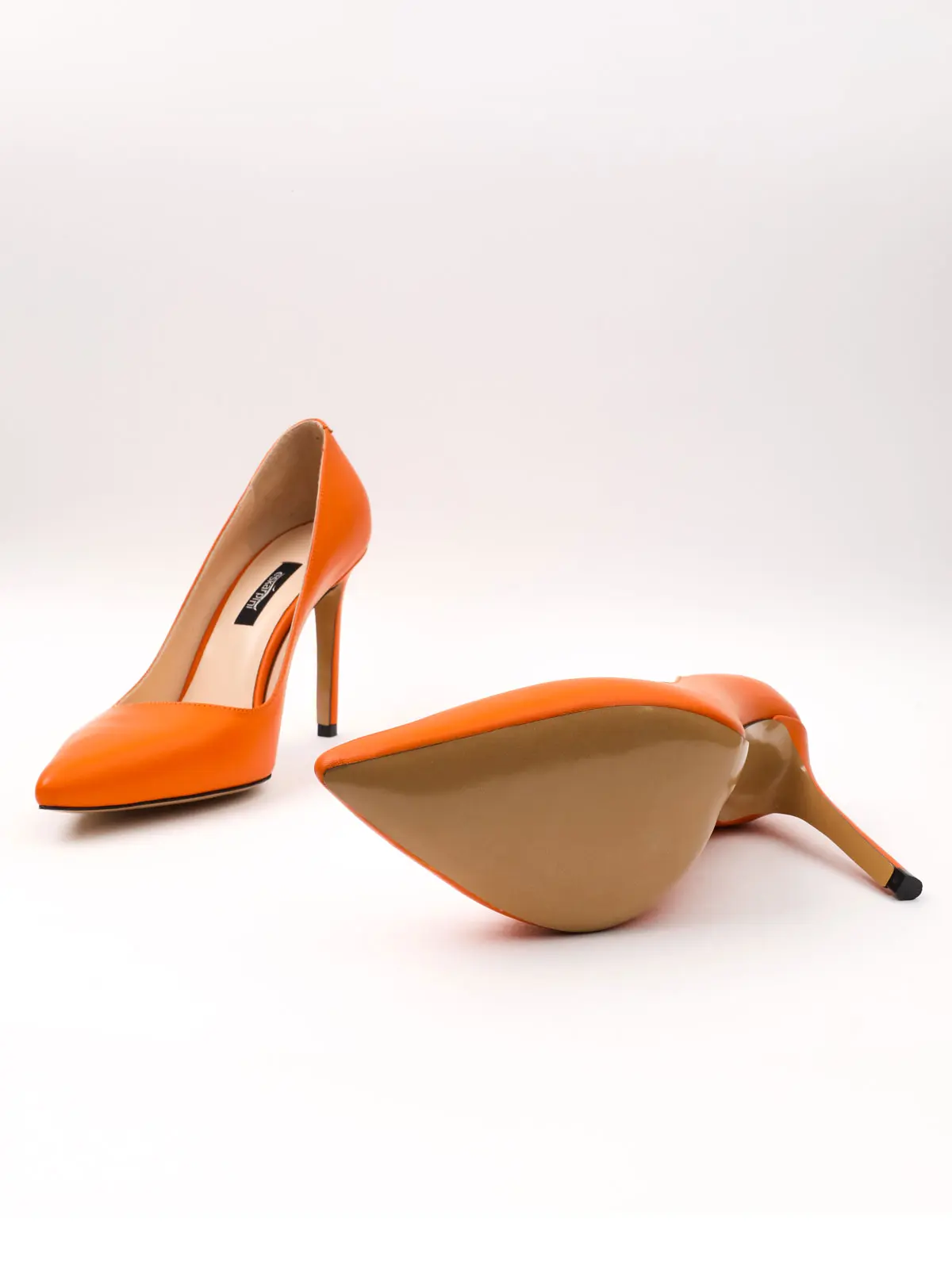 Eskarpini'nin özel koleksiyonundan olan bu turuncu renkli stiletto, cesur ve zarif tarzı seven kadınlar için mükemmel bir seçimdir. Göz alıcı parlak (rugan) doğal deri yüzeyi ve zamansız sivri burun tasarımı ile kombinlerinize canlılık ve şıklık katacak.