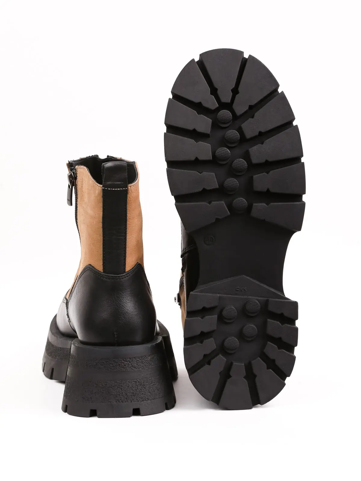 Önden Fermuarlı ve Kalın Tabanlı İki Renkli Hakiki Deri Kadın Bot (Siyah-Camel)